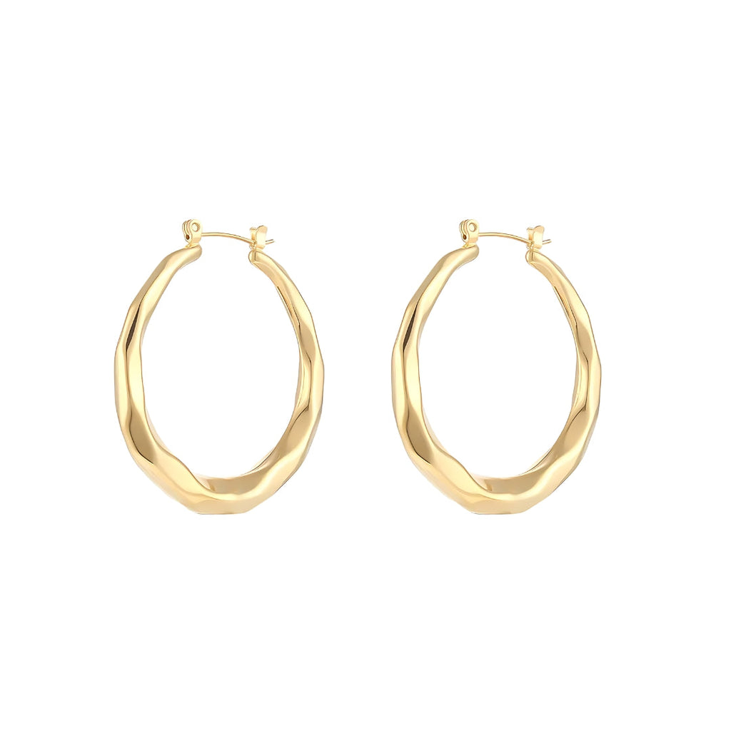 Descubra a sofisticação atemporal com o Brinco Argola Média Assimétrico Banhado em Ouro 18k, uma peça autêntica da nossa exclusiva coleção clássica de semijoias.