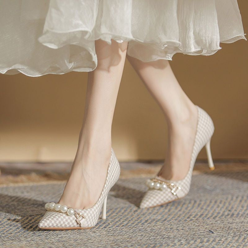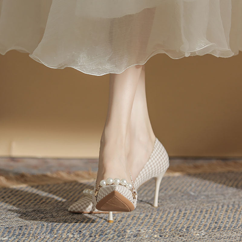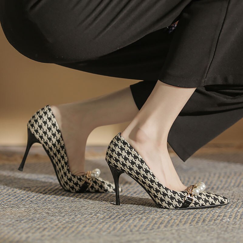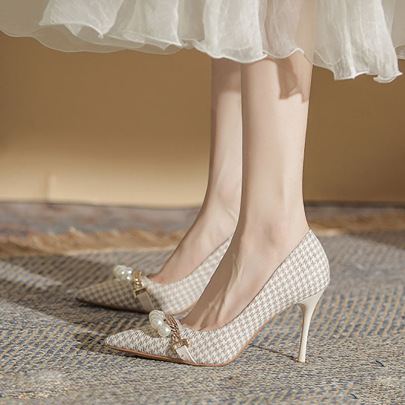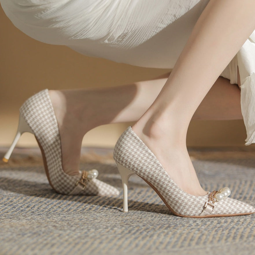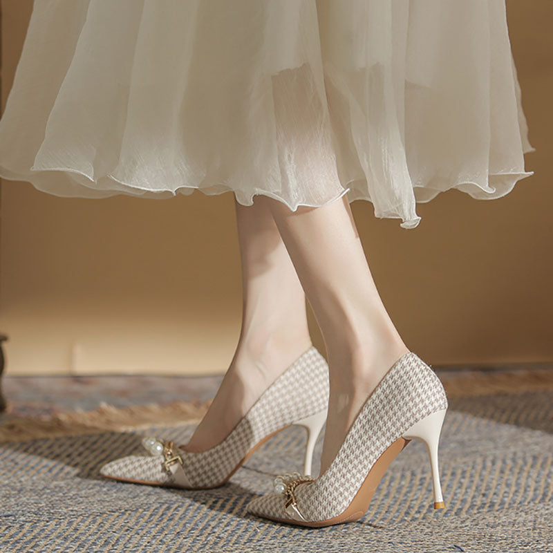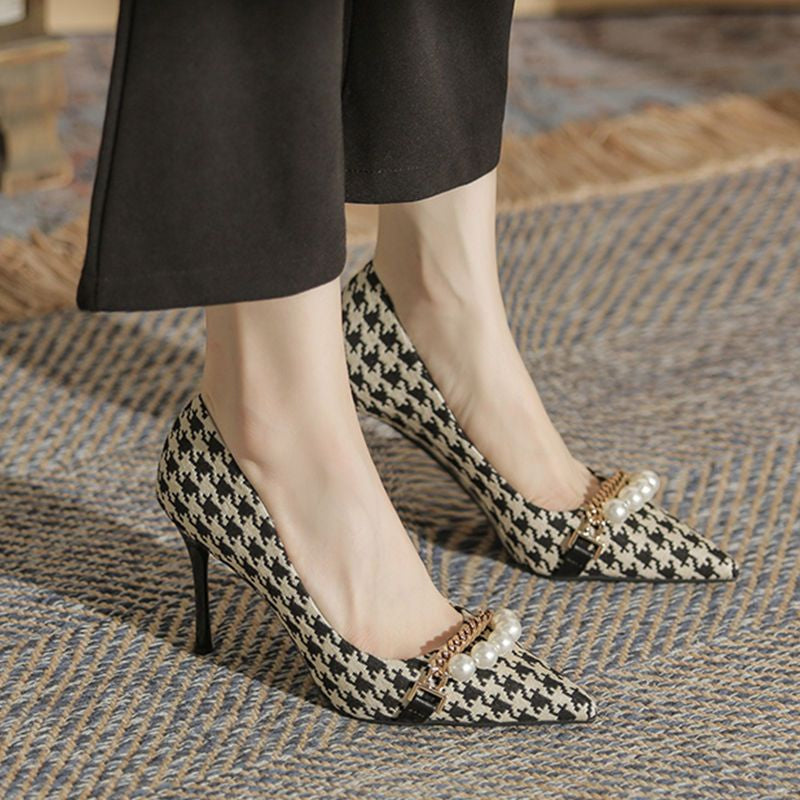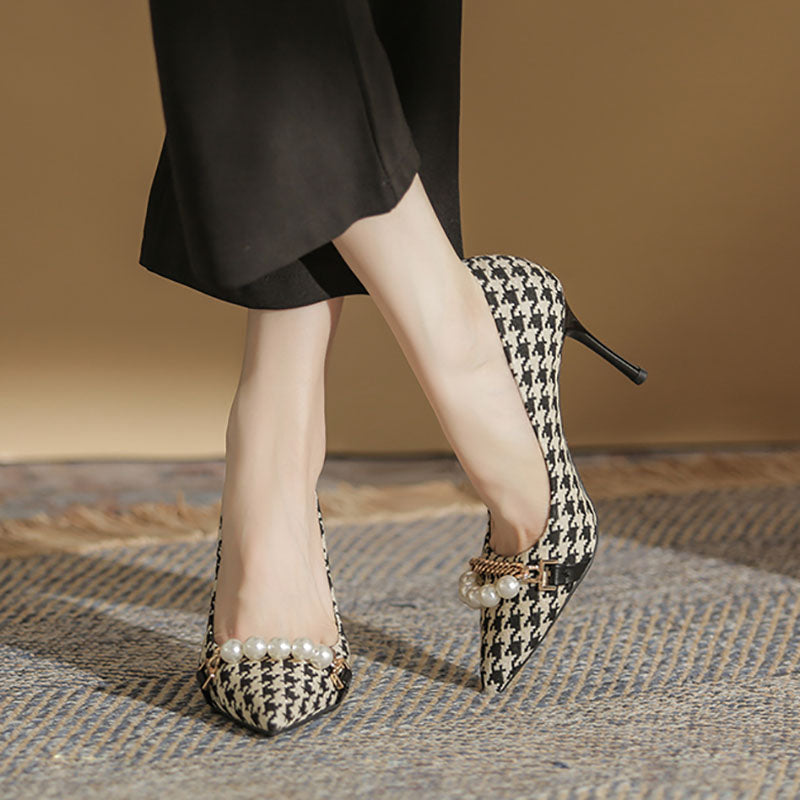 A combinação do design quadriculado, disponível nas cores preta e branca, confere ao Lille um apelo visual distinto, pronto para realçar o seu estilo em várias ocasiões. Os detalhes em pérolas e a corrente dourada sobre o bico adicionam um toque de luxo, elevando ainda mais a sua elegância.